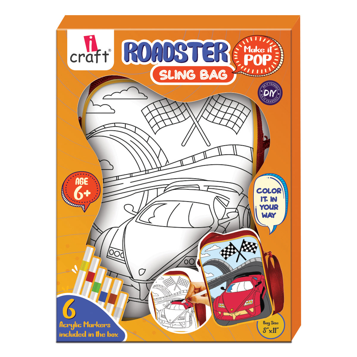 - iCraft ROADSTER DIY Sling Bag for Kids – Paint Your Own Car-Themed Bag with 6 Sketch Pens – Art & Craft Set for Boys Age 6+ – 8"x10" Shoulder Bag with Zip