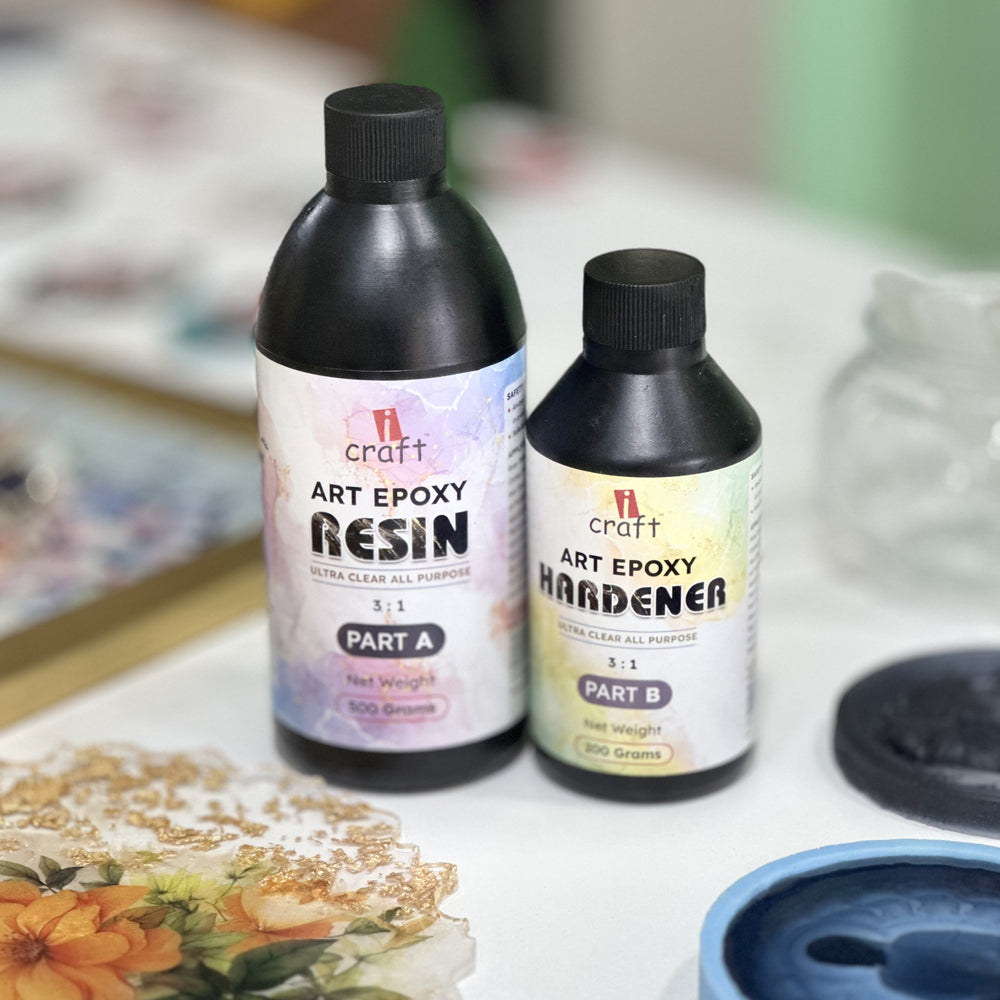 - Resin and Hardener: Resin and hardener are two components that can be mixed together to create a clear and solid material. It is a versatile and creative material that can be used for various art and craft projects. You can use it to make jewelry, coasters, magnets, keychains, and more. You can also add colors, glitter, flowers, and other objects to the resin to create unique and stunning pieces. We have a variety of resin and hardener types and quantities for you to choose from.